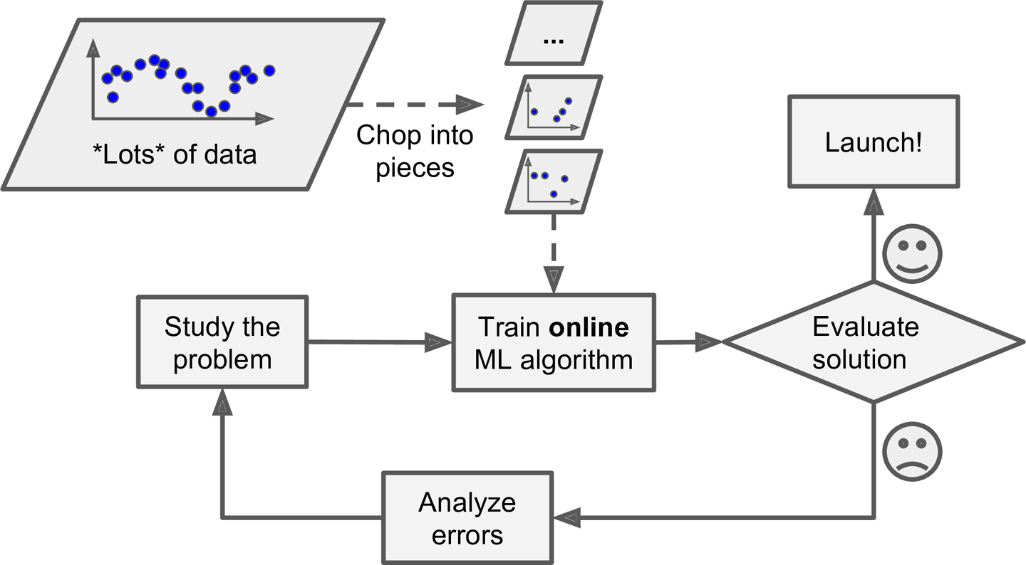 Online Learning은 방대한 양의 데이터 세트에서도 사용될 수 있습니다. (모든 데이터 세트가 메인 메모리에 다 들어가지 않는 경우, out-of-core Learning이라고도 부릅니다.) 전체 데이터 세트를 가능한 만큼 메인 메모리로 나누어서 점진적으로 학습하는 방식입니다. 이때, 데이터를 나누어서 학습을 진행하는 것은 Offline에서 진행됩니다. 여기서 말하는 Offline은 Live의 반대로 생각하면 되며, 거대한 데이터 자체가 새로운 데이터이기 때문에 전체적으로 보았을 때는 Online적인 Learning입니다.