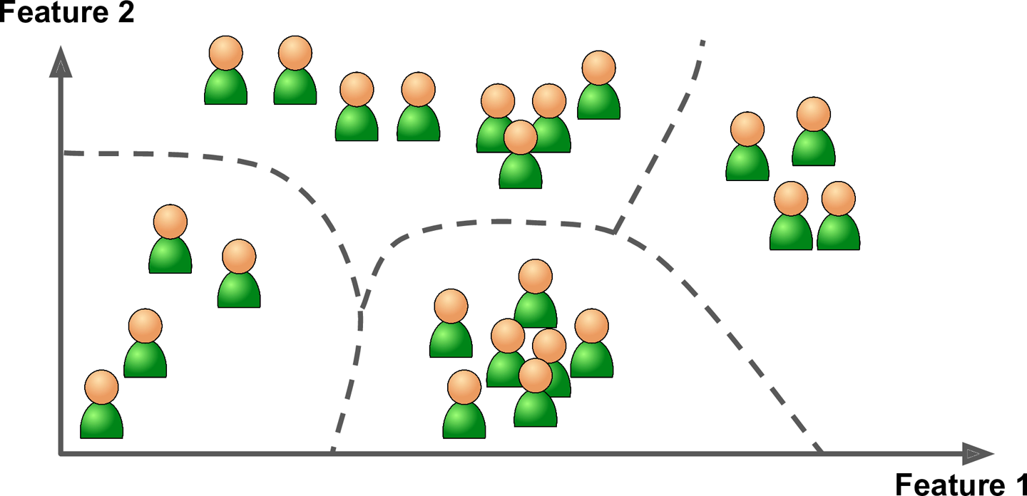 기존 데이터의 다양한 Feature들을 다양한 차원으로 분석하여 집단을 형성하는 방식입니다. Clustering 방식이 대표적입니다. 위와 같은 그림의 학습 데이터는 아래의 Clustering 그림으로 나누어집니다.