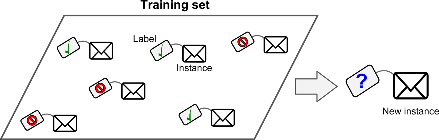 위의 그림은 스팸 메일 분류를 위한 방식을 그림으로 표현한 것입니다. 메일안의 내용들 (Instance)이 있고, 각각의 메일들에는 기존에 스팸을 구분해 놓은 Label이 있습니다. 여기서 Label은 스팸인지 아닌지 두가지 경우를 나누어서 나타내었습니다. 기존의 모든 메일 데이터를 Training Set 학습 데이터 세트로 학습시켜서 새로운 메일이 들어왔을 때, Label이 무엇인지를 예측하는 방법입니다.