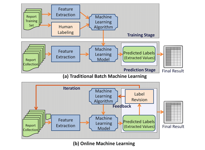 Batch Learning VS Online Learning - https://www.researchgate.net/figure/Online-machine-learning-versus-batch-learning-a-Batch-machine-learning-workflow-b_fig1_316818527
