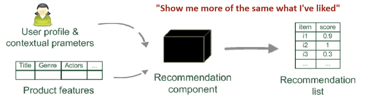 어제의 데이터를 분석하여 내일의 사용자의 행동을 예측하는 머신 러닝 알고리즘으로 가게 되는 것이죠. 이것은 다양한 데이터 소스를 활용하여 소비자의 취향과 원하는 것을 추론하고자 합니다. 사용자와 아이템 간의 상호작용을 점수로서 계산하고, 점수가 높은 것을 추천하는 것입니다.