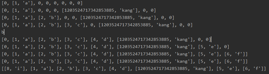 [key, value]가 리스트에 들어가며, 기존의 인덱스가 이미 사용중이라면 해당 인덱스의 리스트에 추가하는 방식입니다. 위에서는 [1, 'a']와 ['name', 'kang']이 같은 hash value를 가지는 것이고 해당 인덱스의 리스트에 함께 포함되어있는 것을 확인 할 수 있습니다.