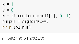 x = 1이고, 가중치 w를 정규 분포 난수로 선언하였습니다. 이것을들 sigmoid함수에 넣어주면 출력이 나옵니다. (아래의 출력값은 가중치 초기화 난수에 따라 달라집니다.)