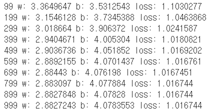 numpy로 계산한 a,b와 텐서플로우로 계산한 w,b가 완전히 일치하진 않지만, 아주 유사함을 확인할 수 있습니다.