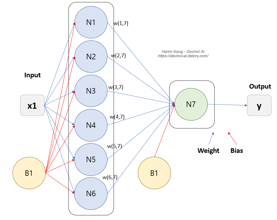 간단하게 뉴런 6개의 1단 레이어 하나와 뉴런 1개의 2단 레이어를 만들었습니다. 활성함수는 하이퍼볼릭 탄젠트(tanh)함수를 사용하였습니다. 출력 값이 -1과 1사이의 값이 나오는 함수입니다.