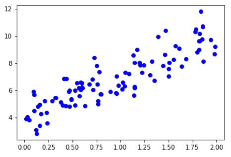 x값의 범위는 0부터 2의 범위의 랜덤값, y값의 범위는 y=3x+4에 0과 1사이의 랜덤값을 추가한 값입니다. y=3x+4의 경향을 가진 데이터라고 보시면 됩니다.
