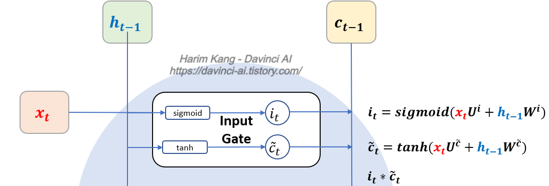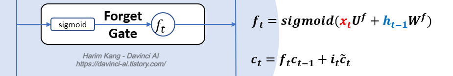 위의 그림처럼 LSTM 레이어는 Input Gate, Forget Gate, Output Gate라는 c(cell state)의 값을 제어하는 게이트들이 존재합니다. 각 게이트들은 sigmoid layer와 pointwise곱 연산을 통해서 값을 제어합니다.