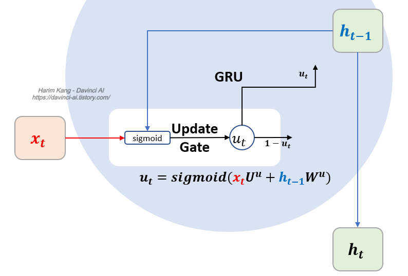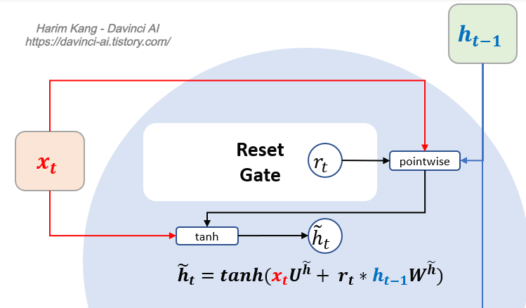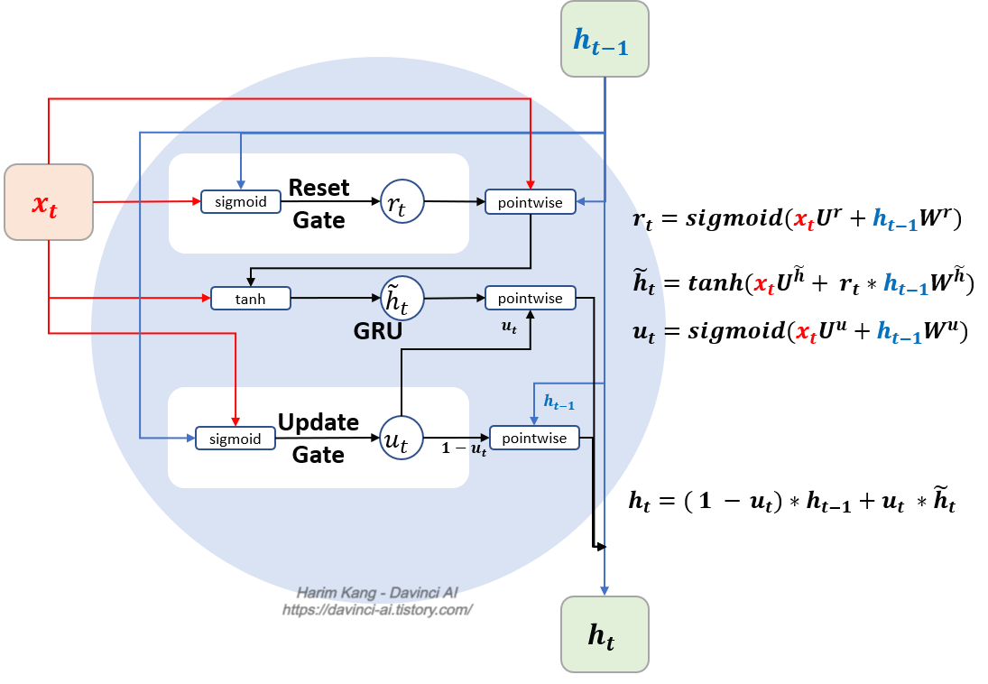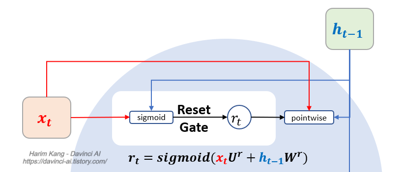 위의 그림처럼 GRU레이어는 Reset Gate, Update Gate들로 이루어져 있습니다. 각 게이트들은 sigmoid layer와 pointwise곱 연산을 통해서 값을 제어합니다.