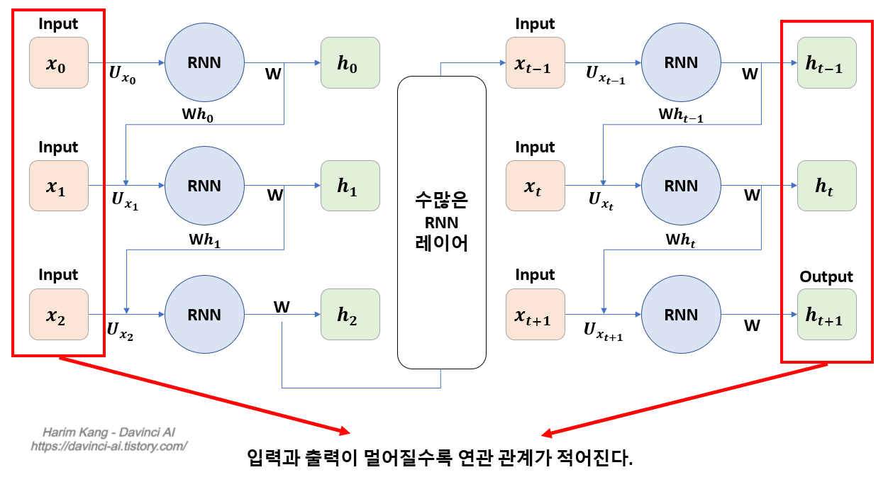 간단한 RNN의 구조로는 위와 같은 장기 의존성 문제가 발생합니다. 이를 해결하기위해서 제안된 RNN의 변형 구조가 바로 LSTM입니다.