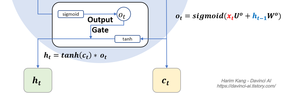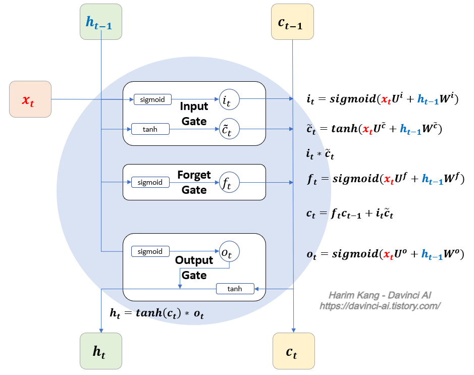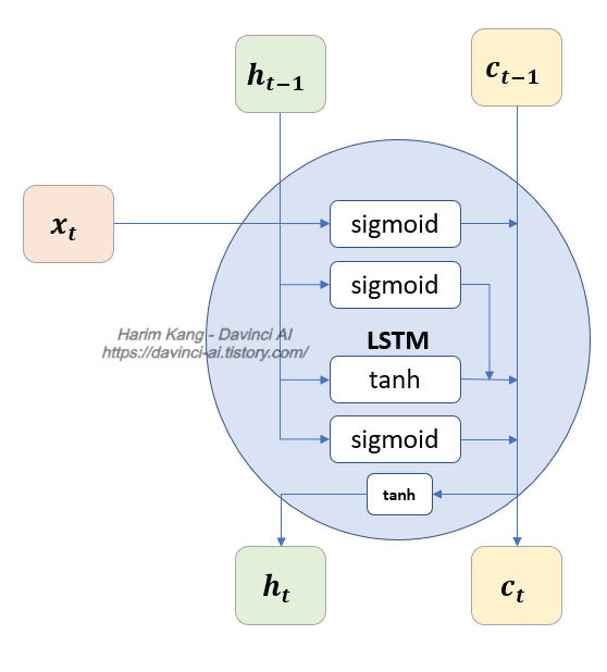 위의 그림처럼 LSTM 레이어는 Input Gate, Forget Gate, Output Gate라는 c(cell state)의 값을 제어하는 게이트들이 존재합니다. 각 게이트들은 sigmoid layer와 pointwise곱 연산을 통해서 값을 제어합니다.