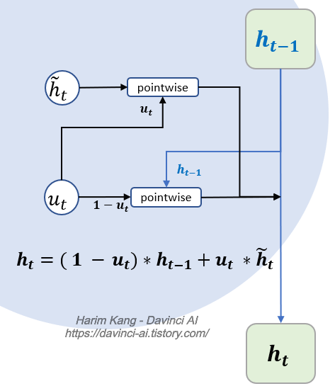 위의 그림처럼 GRU레이어는 Reset Gate, Update Gate들로 이루어져 있습니다. 각 게이트들은 sigmoid layer와 pointwise곱 연산을 통해서 값을 제어합니다.