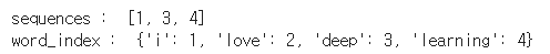 해당 토크 나이저는 i-1, love-2, deep-3, learning-4로 index가 지정되었고, 두 번째 문장에서는 1, 3, 4에 해당되는 단어들만 찾은 것을 알 수 있습니다.