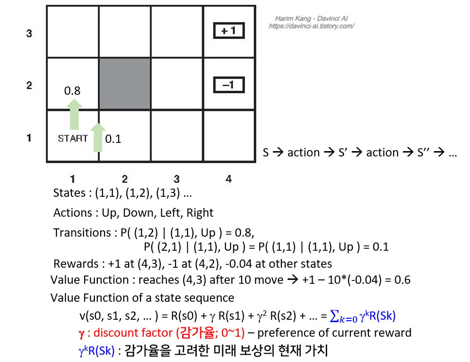 강화학습은 결정을 순차적으로 내려야 하는 문제에 적용을 합니다. 순차적으로 내려야 하는 문제를 정의하기 위해서는 MDP(Markov Decision Process)를 사용합니다.