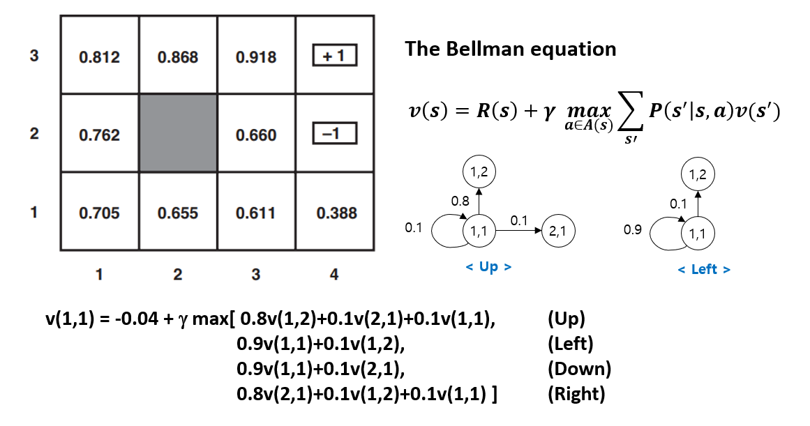 위의 그림을 보시면, 벨만 방정식을 사용하여 각각 상태에 대한 가치함수 기대값을 얻을 수 있습니다. 이것들을 모두 계산하여 최적의 정책을 찾는 것입니다.