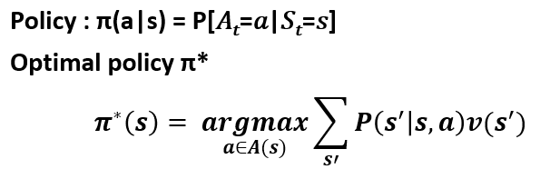 모든 상태에서 에이전트가 할 행동을 의미합니다. 최적의 정책은 부분 수열 상태의 기대값이 최대가 되는 정책입니다.