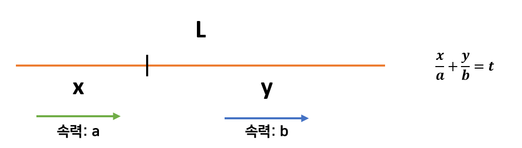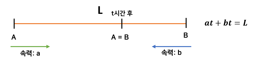 걷는 속력이 a인 A와 속력이 b인 B가 L만큼 떨어져 있습니다. 서로 마주보며 걸어올 때, 만나는 시간을 구하는 문제입니다.