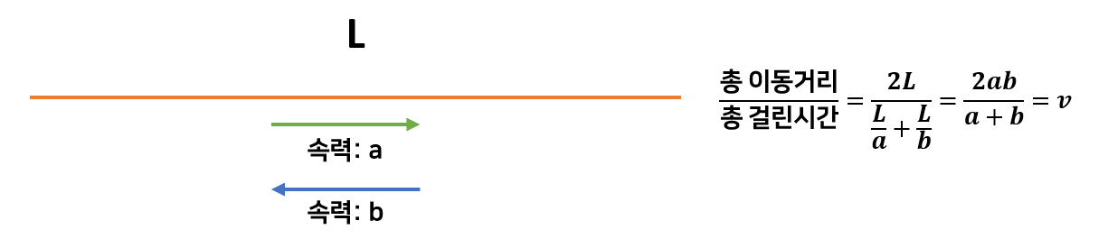 전체 거리가 L인 도로를 왕복할 때, 속력이 갈때는 a, 돌아올 때는 b이면, 평균 속력을 구하는 문제가 기본적인 문제입니다.