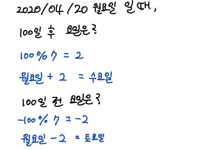 특정 날짜의 요일이 a요일 일 때, n일 전의 요일을 찾고자합니다. -n을 7로 나눈 나머지가 -b일 때, n일 후의 요일은 a-b요일 입니다.
