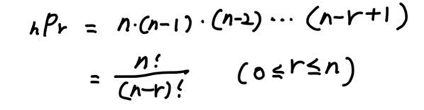서로 다른 n개의 원소에서 서로 다른 r개를 택하여 순서를 고려하여 배열하는 순열이라고 합니다. 아래와 같은 식으로 나타냅니다.