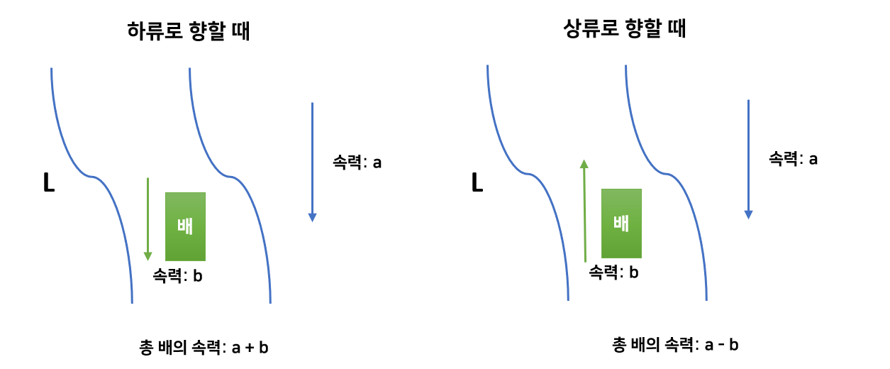 강의 속력 a와 배의 속력 b가 주어졌을 때, 상황에 따라 속력이 달라지는 문제입니다.