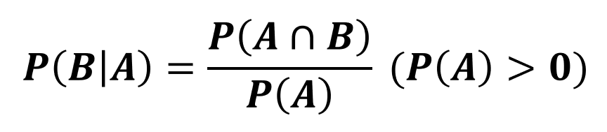 조건부 확률: 확률이 0이 아닌 사건 A, B에 대하여 A가 일어났을 때, B가 일어날 확률을 조건부 확률이라고 하고 아래와 같은 공식으로 구합니다.