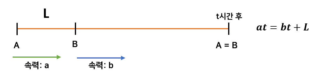 A와 B가 달리기를 할 때, 동시에 출발하면 t 시간 후에 A가 B를 따라잡습니다. B가 L만큼 앞에서 출발하고, A의 속력은 a, B의 속력은 b일 때 따라잡는 시간을 구하는 문제입니다.