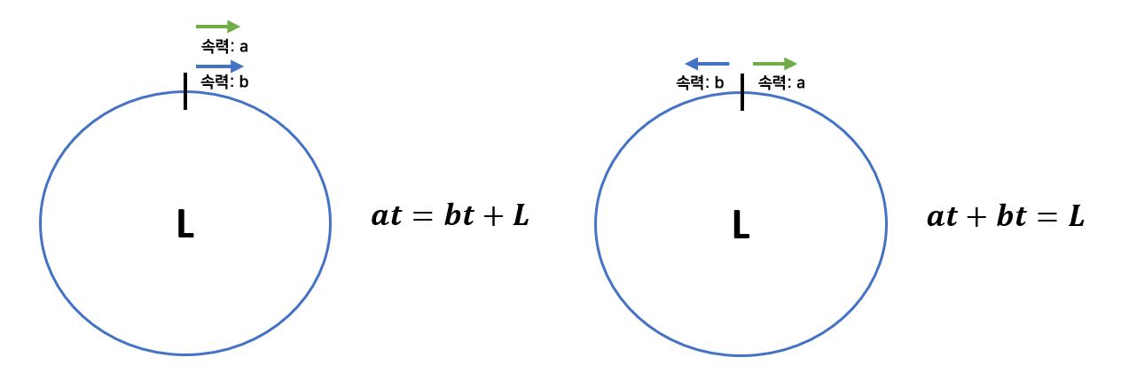 한 바퀴 거리가 L인 운동장에서 A 속력은 a, B 속력은 b이고 동시에 출발할 때의 문제입니다.