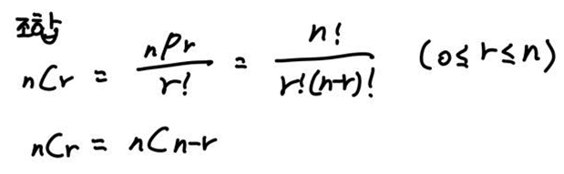 서로 다른 n개의 원소에서 순서를 고려하지 않고 r개를 택하는 것을 조합이라고 합니다. 아래와 같은 식으로 나타냅니다.