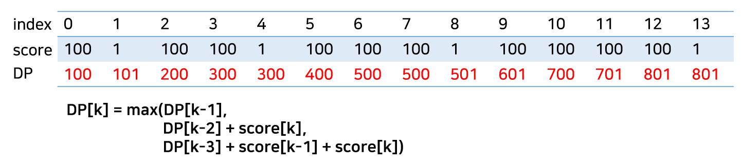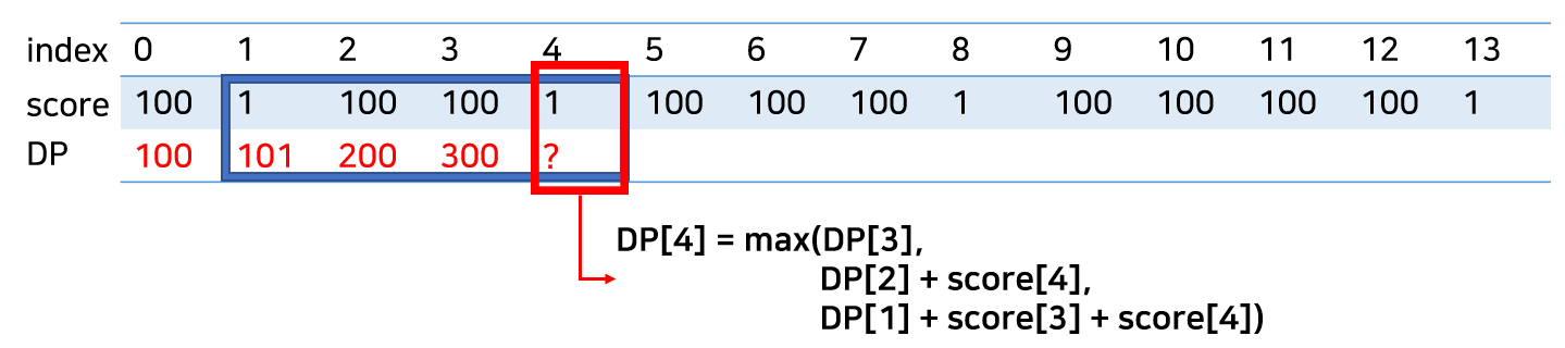 위와같이, 앞에서 계산된 최대값을 이용하여 그 상황에서 얻을 수 있는 최대값을 넣습니다.