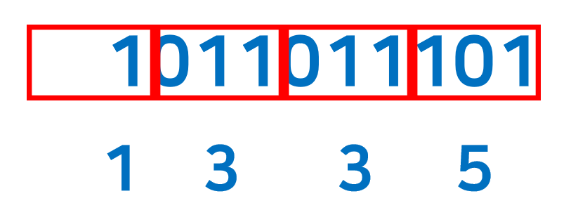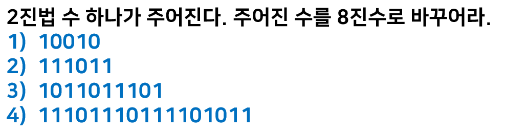 해당 문제는 맨 오른쪽 수부터 세자리 씩 묶어서 보면 편합니다. 세자리씩 묶어서 그 숫자를 10진수로 변환하면 됩니다.