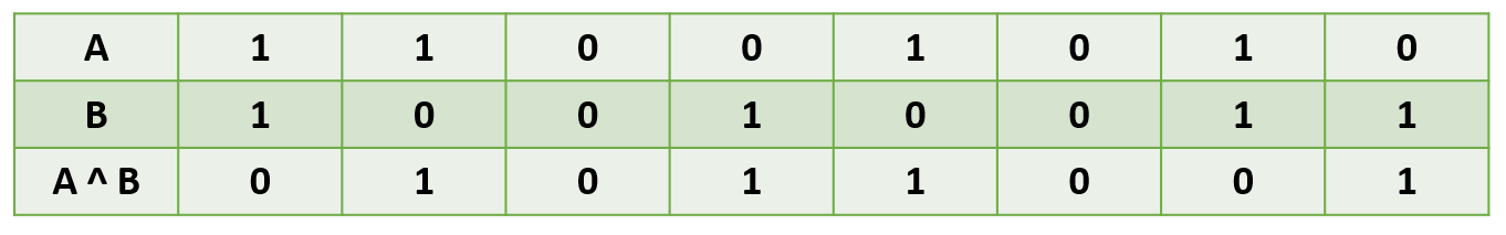 XOR(^): 2진법 수에 대해 A^B는 각 빝트에 대해 서로 다른 값이 들어있는지를 판단하는 연산입니다.