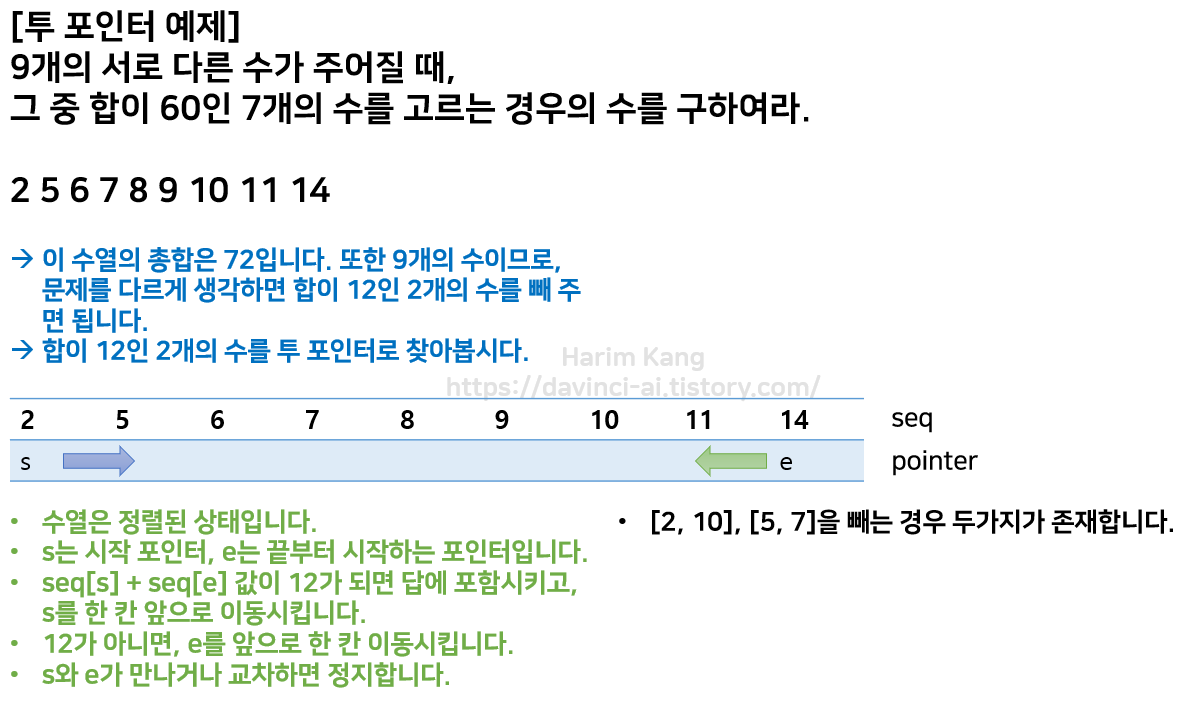 투 포인터란 배열 또는 수열이 존재할 때, start와 end를 지정하는 포인터를 두는 것을 의미합니다.