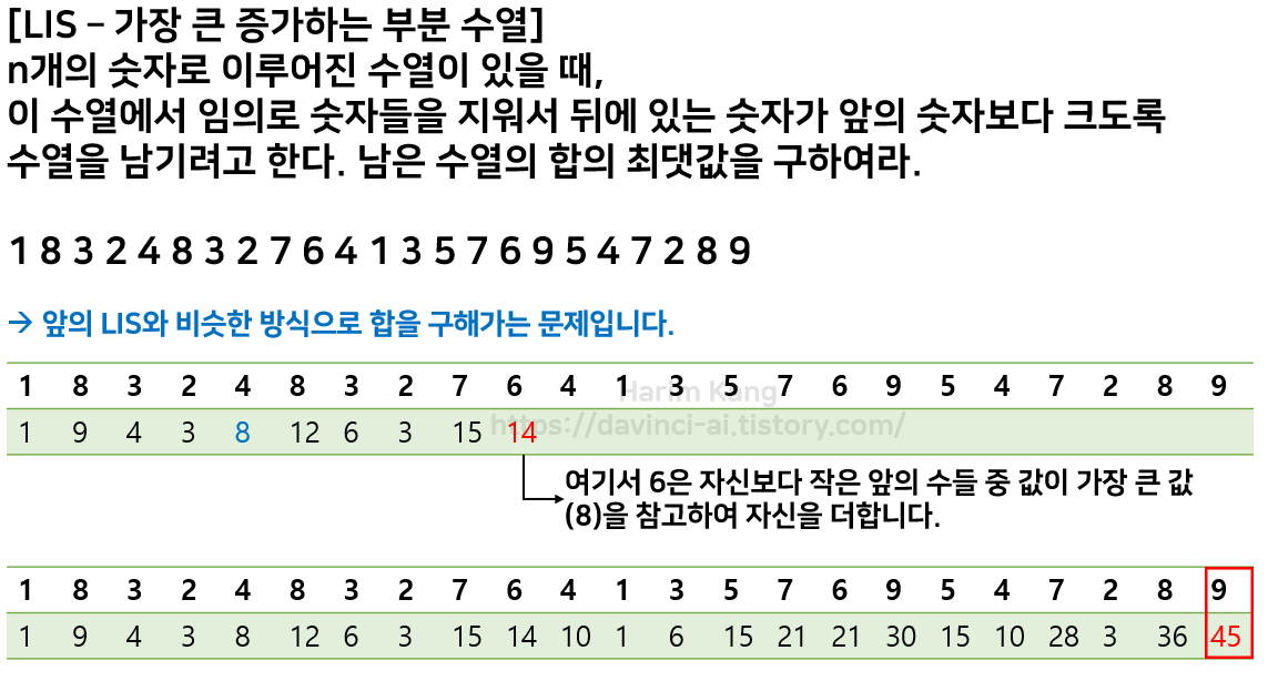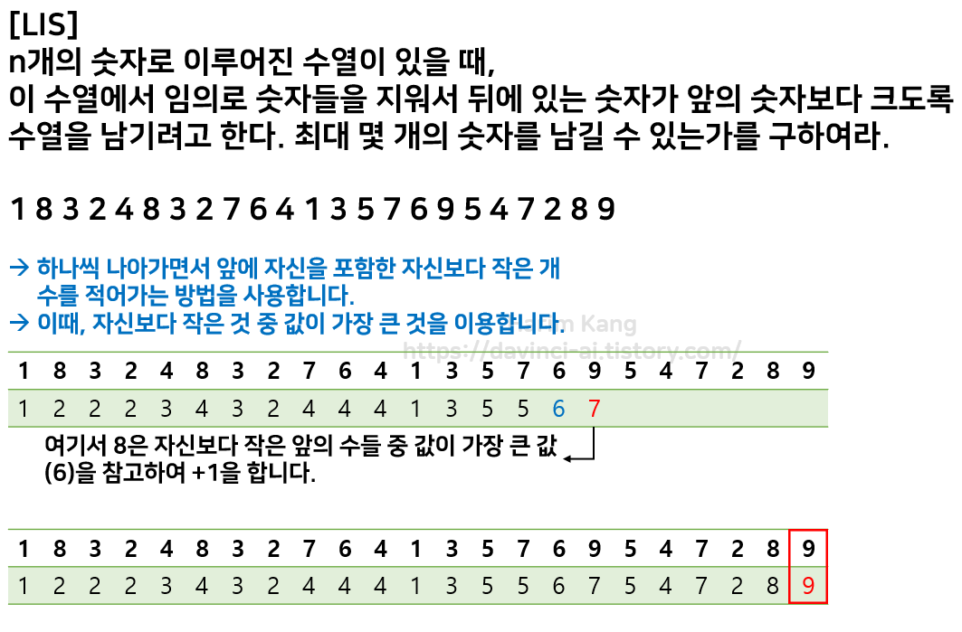예를 들어 1 3 4 2라는 수열이 있을 때, [1, 3], [1, 4], [3, 4], [1, 2]가 길이가 2인 LIS입니다.