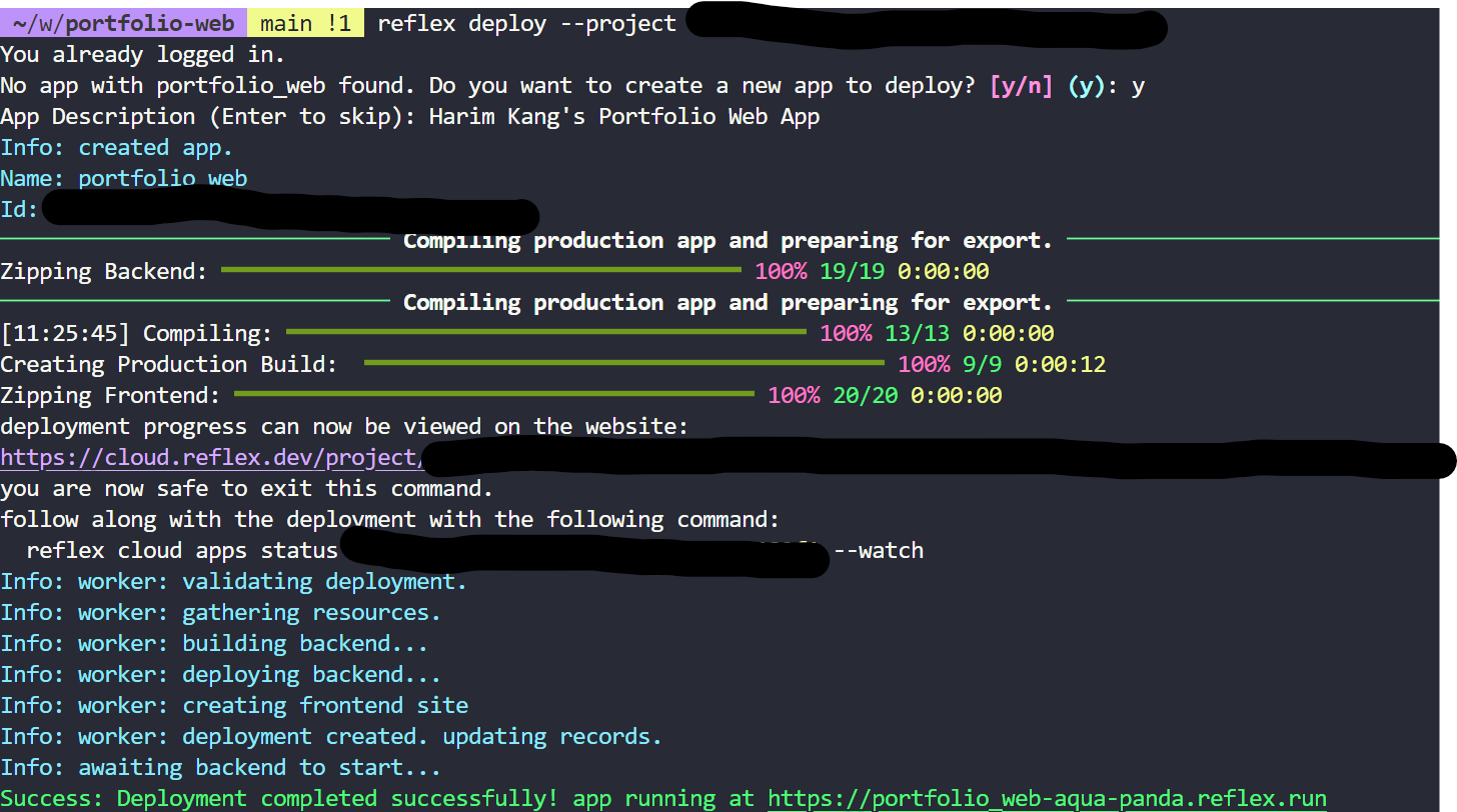 pip install reflexreflex initreflex runReflex는 개발된 애플리케이션을 배포하는 과정도 간소화합니다. 다음은 배포 과정을 간단히 요약한 것입니다: