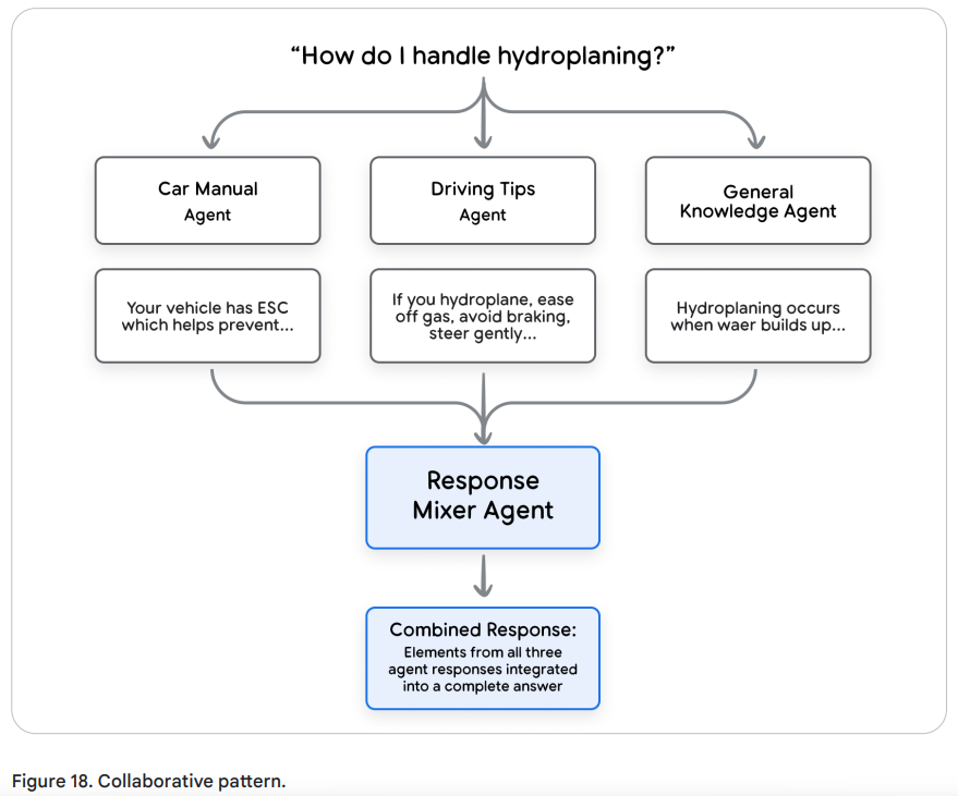 협업 패턴 (Collaborative Pattern): 여러 에이전트가 동일 작업의 보완적인 측면에서 협력하며, 응답 믹서 에이전트(Response Mixer Agent)가 서로 다른 에이전트의 응답 요소들을 조합하여 포괄적인 답변을 생성합니다. 이 접근 방식은 서로 다른 에이전트가 전문 지식 기반으로 완성된 솔루션에 가치 있는 부분을 기여한다는 점을 인지합니다. 특히 쿼리의 여러 측면이 다른 유형의 전문 지식을 요구하거나, 어떤 단일 에이전트도 완전한 정보를 가지고 있지 않을 때 유용합니다. 응답 믹서 에이전트(Response Mixer Agent)는 여러 에이전트의 응답 중 가장 관련성 높고 정확한 부분을 선택하고 결합하여 사용자에게 가장 유용한 답변을 만듭니다.