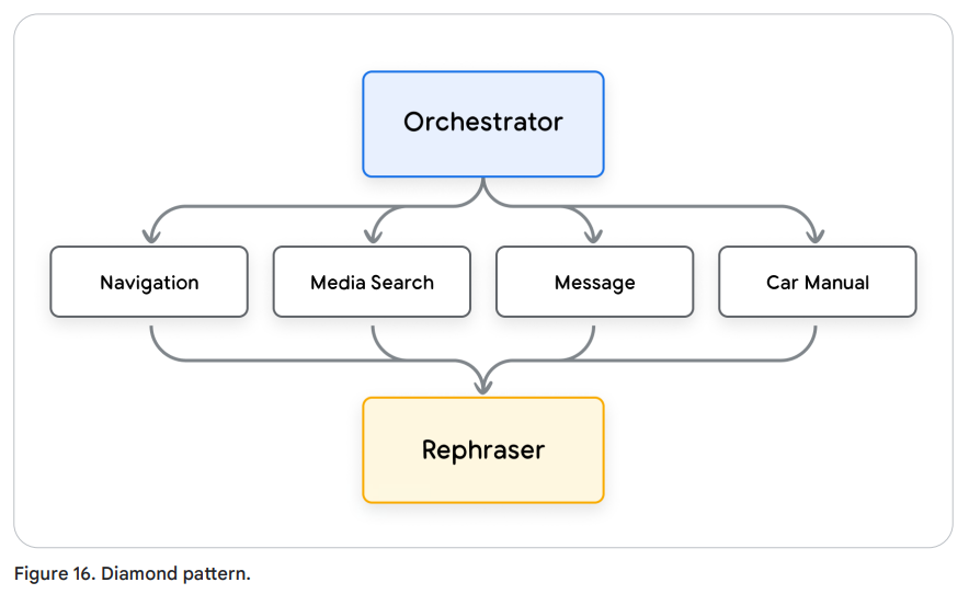 다이아몬드 패턴 (Diamond Pattern): 계층적 패턴의 변형으로, 특화 에이전트의 응답이 사용자에게 도달하기 전에 중앙의 조정 에이전트(예: Rephraser Agent)를 거칩니다. 리프레이저 에이전트(Rephraser Agent)는 응답의 톤, 스타일, 표현 방식을 사용자의 선호도나 맥락에 맞게 조정하는 데 특화되어 있습니다. 예를 들어, 기술적인 정보를 대화형 언어로 바꾸거나, 운전 상황에 따라 정보 밀도를 조정하고 긴급성을 반영합니다.