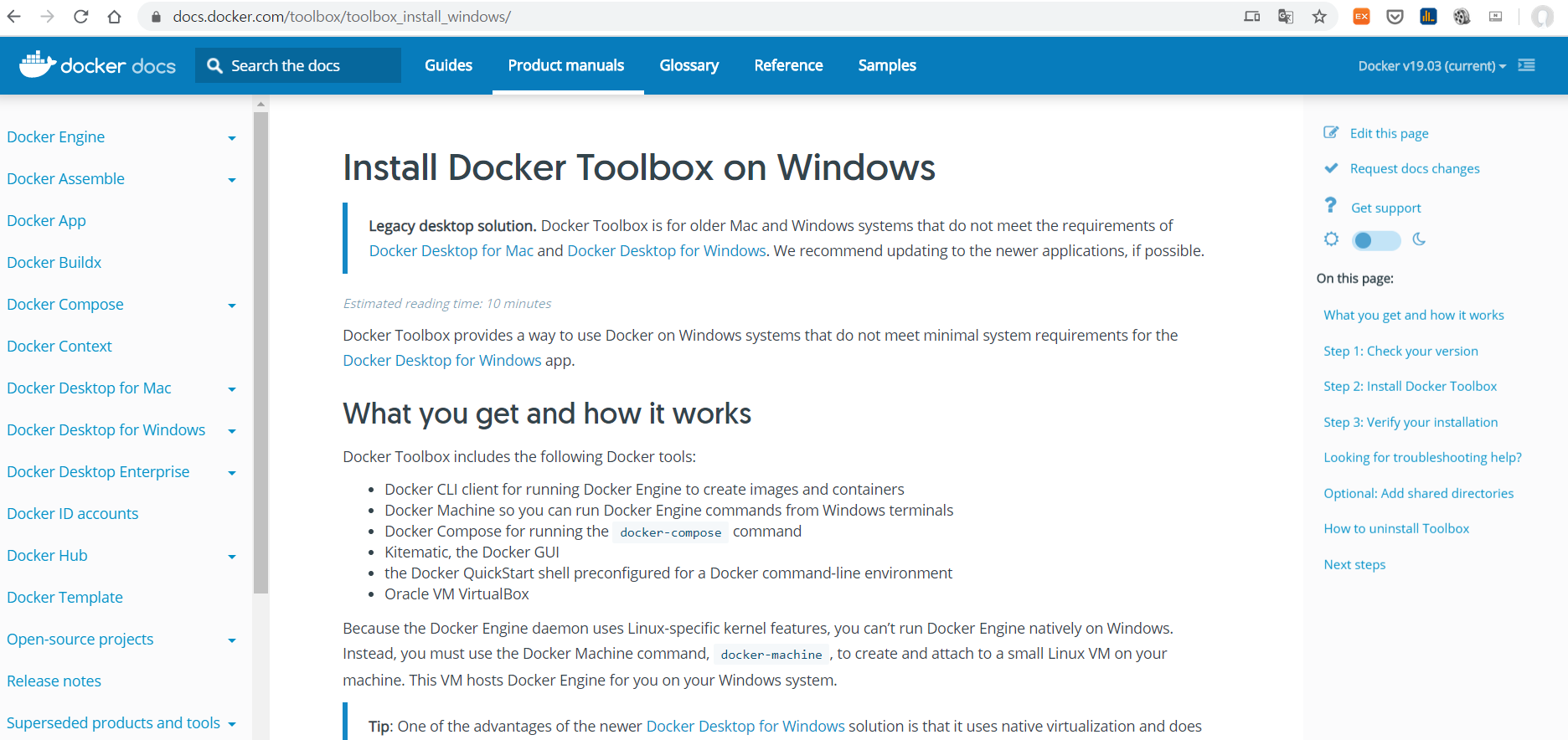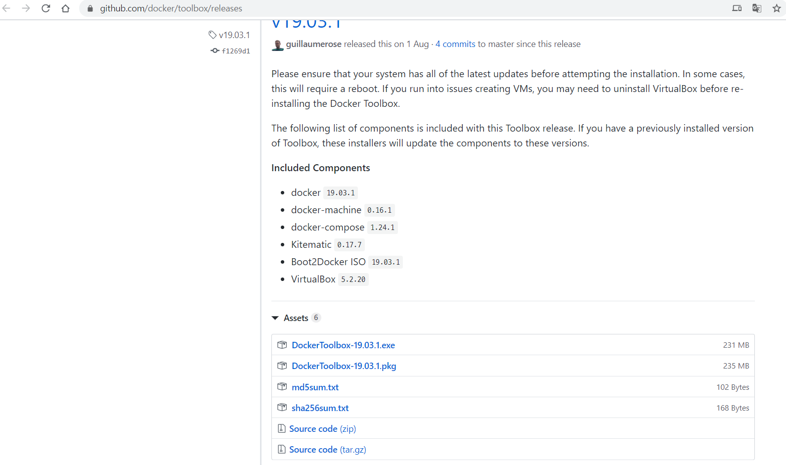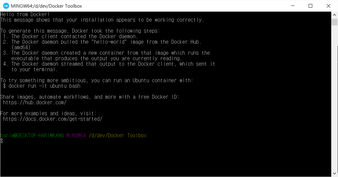 Windows 10 pro는 Docker for Windows를 설치하여야 하고, Windows 7, 8, 10은 Docker toolbox를 설치하면 됩니다. 해당 포스팅에서는 Windows 10 기준이므로, Docker toolbox를 설치해보겠습니다.